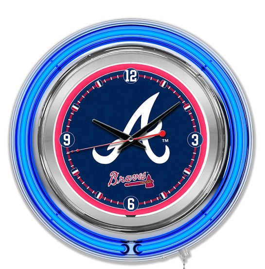 Our double neon MLB Baseball Logo Clocks are the perfect way to show your team pride. Featuring a chrome casing and a team color specific neon outer ring that accents the custom printed clock face which is lit up by an brilliant white, inner neon ring. The Neon rings are easily turned on and off with a pull chain on the bottom of the clock, and are powered by a UL Listed power transformer that runs off standard 120V outlet. Accurate quartz movement ensures proper time and is powered by a single, AA battery (not included). Whether purchasing as a gift for a sports super fan, or for yourself, you can take satisfaction knowing you're buying a clock that is proudly made in Holland, MI USA.