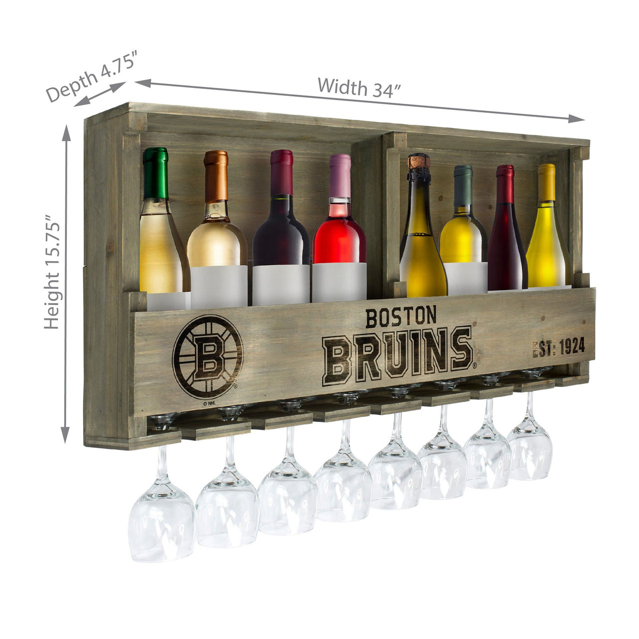 Enjoy your team themed bar shelf for years to come. Holds up to 8 bottles and 8 stem glasses easily. You choose your favorite beverage and team! The vintage reclaimed look will fit in anywhere you gather your friends and family. Perfect gift for the fan who has everything. Mounts easily to any wall.
