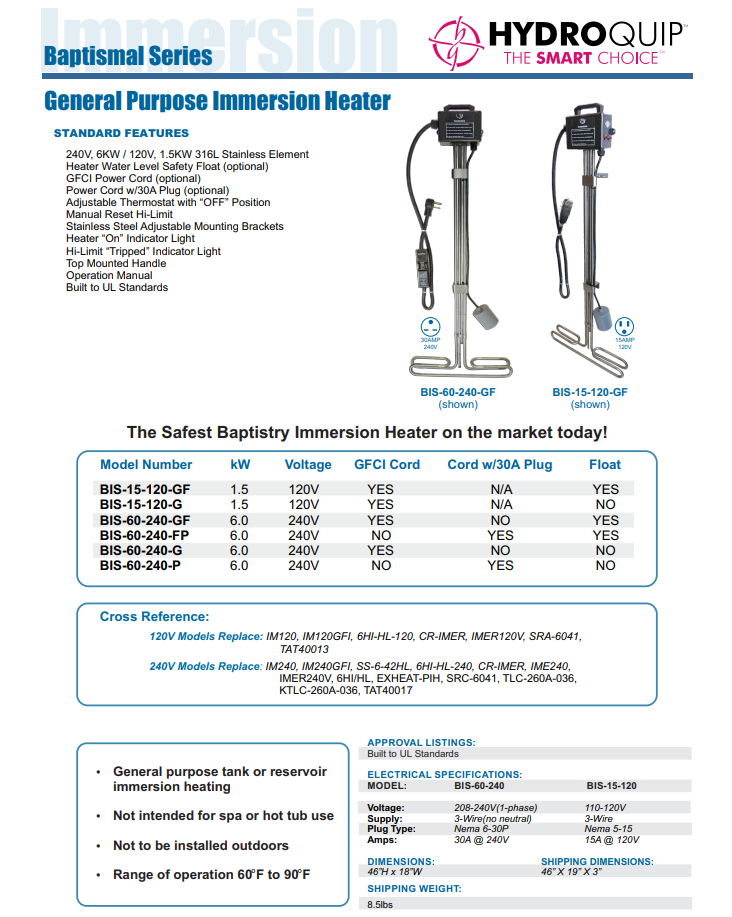 SALE Quick view sku: BIS-60-240-GF HydroQuip Baptistry 6.0kW 240V Immersion Heater BIS-60-240-GF HydroQuip Baptistry 6.0kW 240V Immersion Heater BIS-60-240-GF FREE SHIPPING View all HQ Inline Bath Heaters Description Baptistry Immersion Heater, 6.0kW, 240V, 30 Amp GFCI, Water Level Float Switch The Safest Baptistry... MSRP: Was: $699.99 Now: $599.99 Add to Cart Compare
