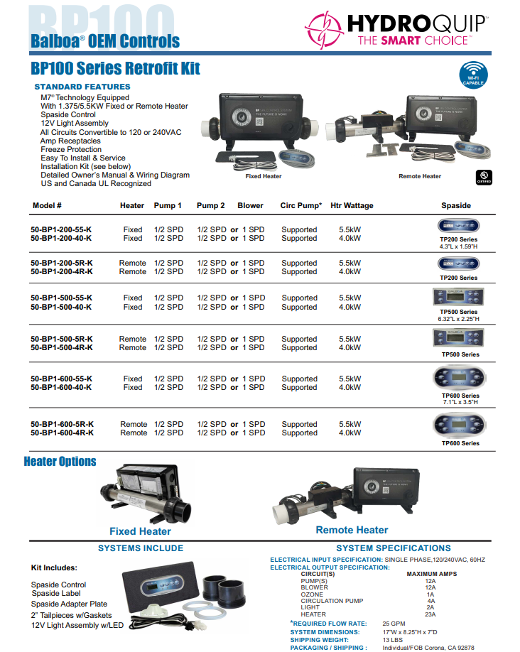 SALE Quick view sku: 50-BP1-200-55-C Water Pro BP100 Retro-Fit Spa Control 5.5kW Low Flow Heater TP200 Panel 50-BP1-200-55-C Water Pro BP100 Retro-Fit Spa Control 5.5kW Low Flow Heater TP200 Panel 50-BP1-200-55-C 50-BP1-200-55-C Water Pro BP100 Retro-Fit Spa Control 5.5kW Low Flow Heater TP200 Panel 50-BP1-200-55-C. Features: M8 Technology Equipped Wifi... MSRP: Was: $697.98 Now: $580.98 Add to Cart Compare