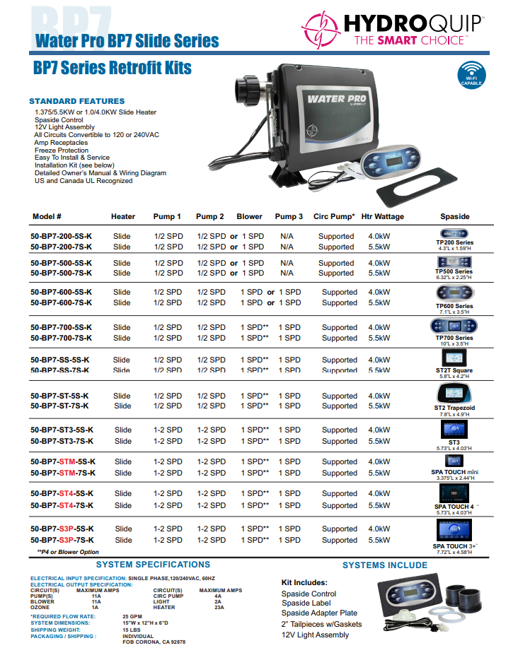 SALE Quick view sku: 50-BP7-200-40-S Water Pro BP7 Retro-Fit Spa Control 4.0kW Slide Heater TP200 Panel 50-BP7-200-40-S Water Pro BP7 Retro-Fit Spa Control 4.0kW Slide Heater TP200 Panel 50-BP7-200-40-S 50-BP7-200-40-K Description Water Pro BP7 Series Retro Fit Kits Water Pro BP7 Retro-Fit Spa Control with 4.0kW Slide Heater and... MSRP: Was: $599.99 Now: $455.55 Add to Cart Compare
