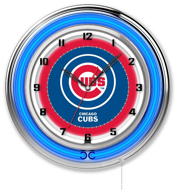 Our double neon MLB Baseball Logo Clocks are the perfect way to show your team pride. Featuring a chrome casing and a team color specific neon outer ring that accents the custom printed clock face which is lit up by a brilliant white, inner neon ring. The Neon rings are easily turned on and off with a pull chain on the bottom of the clock, and are powered by a UL Listed power transformer that runs off standard 120V outlet. Accurate quartz movement ensures proper time and is powered by a single, AA battery (not included). Whether purchasing as a gift for a sports super fan, or for yourself, you can take satisfaction knowing you're buying a clock that is proudly made in Holland, MI USA.