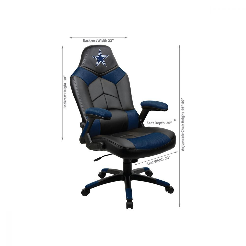 Support Dallas Cowboys While Sitting At Your Desk, Playing Your Favorite Online Game, Listening To Your Favorite Music, Or Just Watching TV In Your Officially Licensed NFL Oversized Gaming Chair! This Chair Has An Oversized Seat And Back For Extra Comfort. Embroidered Team Logo On The Headrest And Pouch. Memory Foam In The Seat And Padded Armrests Make This The Most Comfortable Gaming Chair You Can Buy. Unique Pouch Allows You To Keep Gaming Accessories Handy And Protected. 350mm Black Powder Coated Nylon Base And Butterfly Tilt Mechanism. 325 Pound Weight Capacity. Product Dimensions: 26x 29 1/2 X 49 ; Weighs 37 Pounds