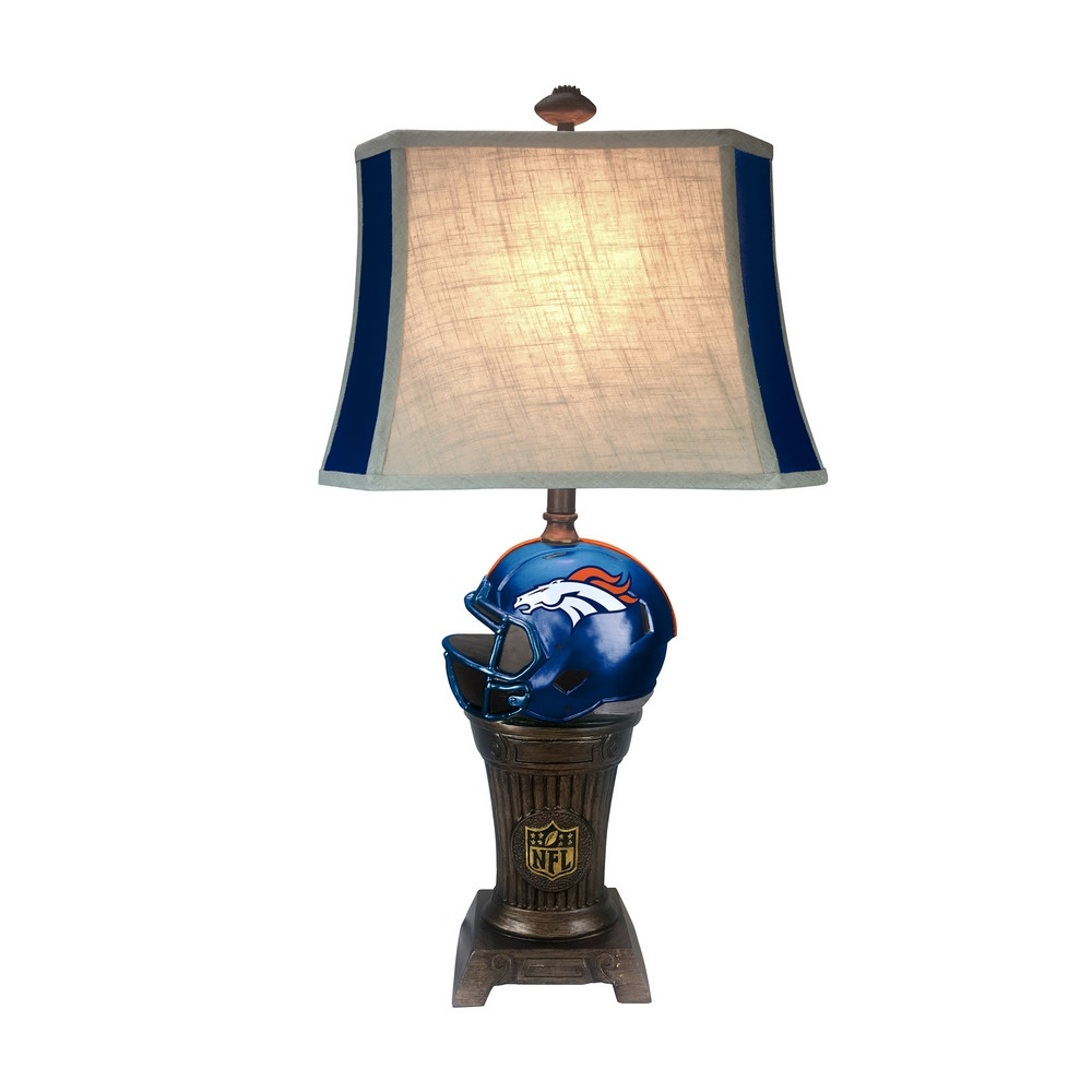 The NFL Official Licensed Trophy Lamp is the perfect piece to complete your Man Cave or NFL themed room! This lamp is 32-inches tall with a hand painted helmet on top of of the Trophy base. Antique colors create an aged appearance. Linen shade is highlighted with team colors.