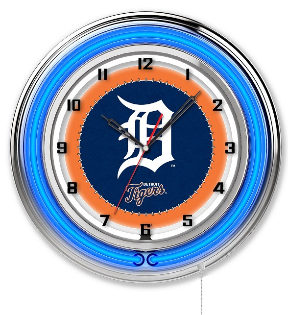 Our double neon MLB Baseball Logo Clocks are the perfect way to show your team pride. Featuring a chrome casing and a team color specific neon outer ring that accents the custom printed clock face which is lit up by a brilliant white, inner neon ring. The Neon rings are easily turned on and off with a pull chain on the bottom of the clock, and are powered by a UL Listed power transformer that runs off standard 120V outlet. Accurate quartz movement ensures proper time and is powered by a single, AA battery (not included). Whether purchasing as a gift for a sports super fan, or for yourself, you can take satisfaction knowing you're buying a clock that is proudly made in Holland, MI USA.