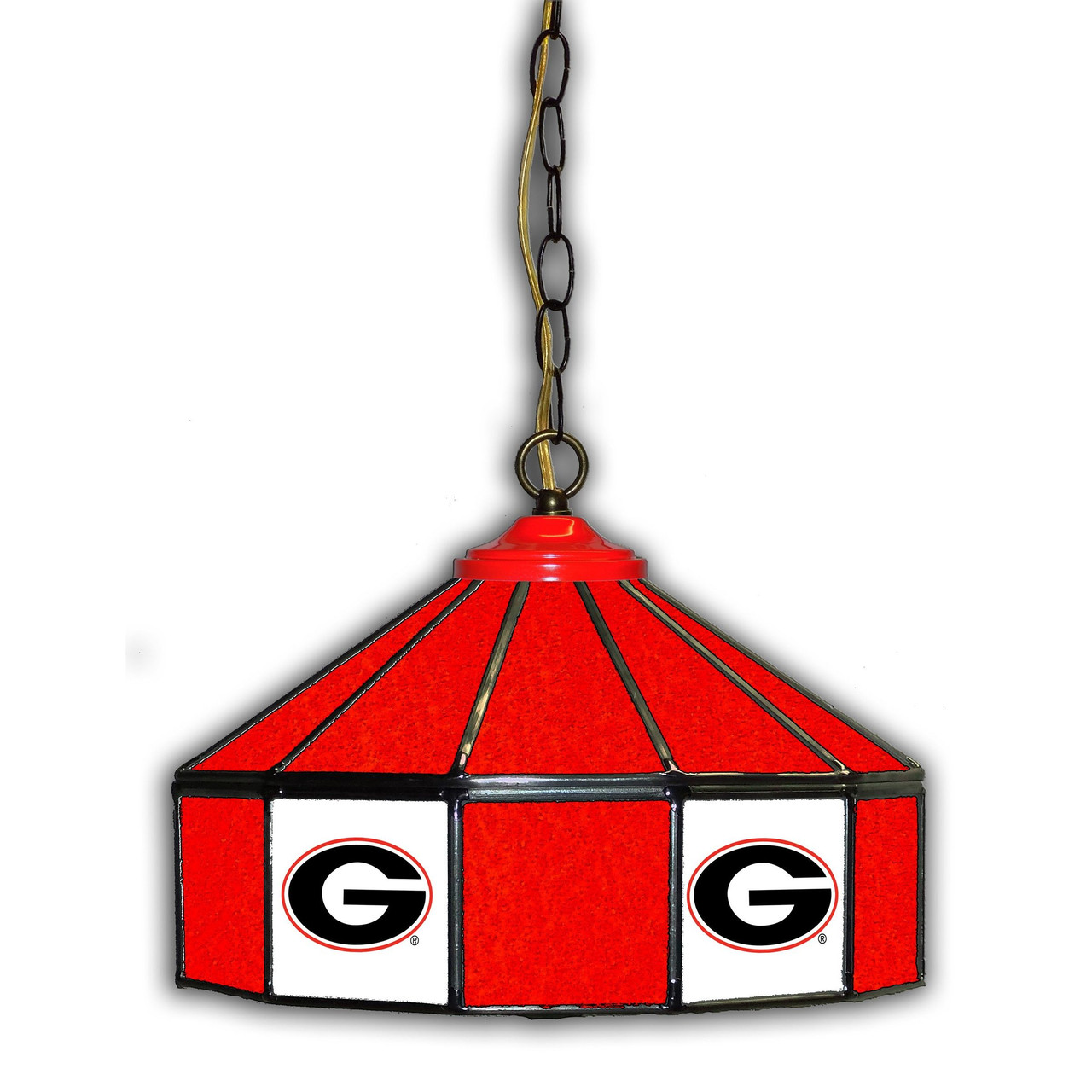 Officially Licensed Collegiate 14-inch Pub Light. Beautifully handcrafted 14-inch diameter old world Tiffany style stained glass hanging pub light. Each piece of glass is individually cut by hand and individually placed by hand. It is then soldered into its proper position with great care and precision by highly trained artists. Fully wired with 1 UL Approved high quality porcelain light socket and a 12-foot cord with inline switch and polarized plug. 9-feet of heavy duty antique brass chain adds a touch of luxury to the lamp. Handmade in the USA. Chain and ceiling mounting hardware not included. Bulb is not included. Lamp measures 14" wide x 10" high; weighs 12 pounds