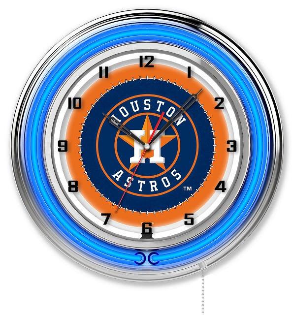 Our double neon MLB Baseball Logo Clocks are the perfect way to show your team pride. Featuring a chrome casing and a team color specific neon outer ring that accents the custom printed clock face which is lit up by a brilliant white, inner neon ring. The Neon rings are easily turned on and off with a pull chain on the bottom of the clock, and are powered by a UL Listed power transformer that runs off standard 120V outlet. Accurate quartz movement ensures proper time and is powered by a single, AA battery (not included). Whether purchasing as a gift for a sports super fan, or for yourself, you can take satisfaction knowing you're buying a clock that is proudly made in Holland, MI USA.