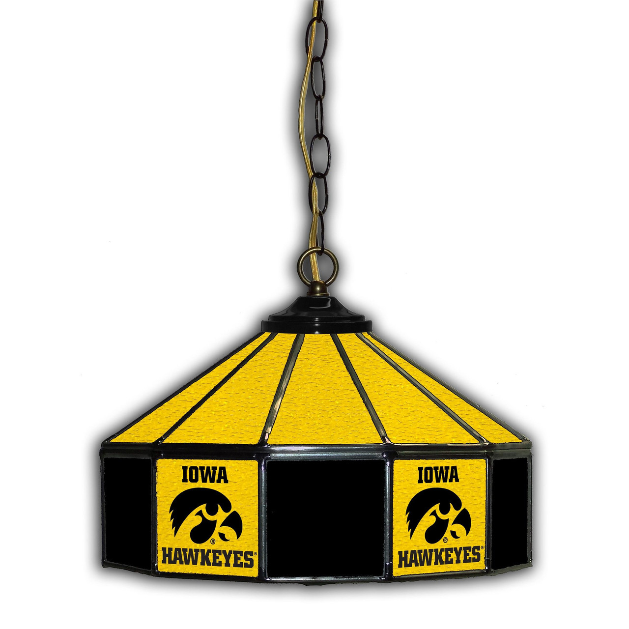 Officially Licensed Collegiate 14-inch Pub Light. Beautifully handcrafted 14-inch diameter old world Tiffany style stained glass hanging pub light. Each piece of glass is individually cut by hand and individually placed by hand. It is then soldered into its proper position with great care and precision by highly trained artists. Fully wired with 1 UL Approved high quality porcelain light socket and a 12-foot cord with inline switch and polarized plug. 9-feet of heavy duty antique brass chain adds a touch of luxury to the lamp. Handmade in the USA. Chain and ceiling mounting hardware not included. Bulb is not included. Lamp measures 14" wide x 10" high; weighs 12 pounds