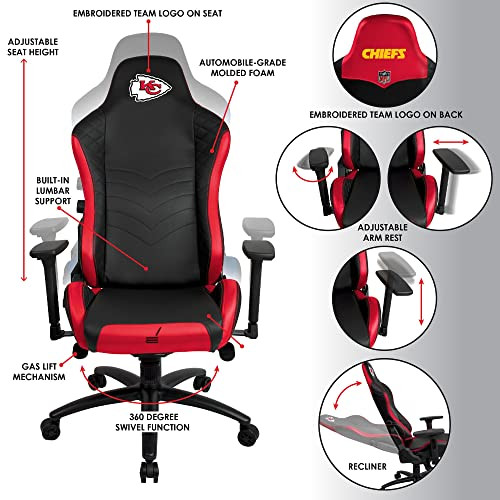 Up your game with your favorite team's Pro Series Gaming Chair by Imperial. This chair is designed to optimize gameplay with its molded steel frame and high-quality PU leather seat with custom automobile-grade foam. Adjustable lumbar support, chair height and armrests make this chair completely versatile, keeping you playing at your best. This chair also features a 360 degree swivel function, rocking and reclining functions, and a gas lift mechanism to make it the ultimate gaming seat. Officially licensed by the NFL, this chair features team colors and embroidered logos on the chair seat and back.