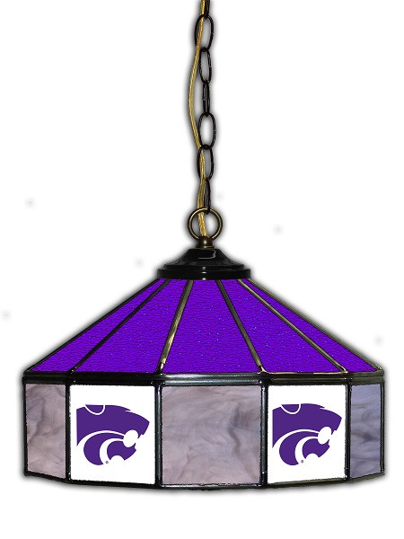 Officially Licensed Collegiate 14-inch Pub Light. Beautifully handcrafted 14-inch diameter old world Tiffany style stained glass hanging pub light. Each piece of glass is individually cut by hand and individually placed by hand. It is then soldered into its proper position with great care and precision by highly trained artists. Fully wired with 1 UL Approved high quality porcelain light socket and a 12-foot cord with inline switch and polarized plug. 9-feet of heavy duty antique brass chain adds a touch of luxury to the lamp. Handmade in the USA. Chain and ceiling mounting hardware not included. Bulb is not included. Lamp measures 14" wide x 10" high; weighs 12 pounds