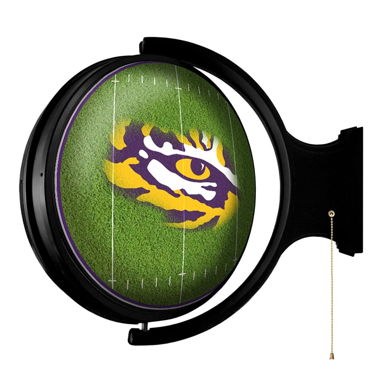 Our Football "On the 50" Rotating Lighted Wall Sign both lights up and spins while allowing you to display your passion for your favorite team. Whether it's your fan cave, office, game room, or garage, this decorative football field design makes a great addition to any wall and is sure to get you ready for gamedays. It showcases the latest in LED technology and only uses 12 watts of power. Injection molded, it comes with an 8 foot power cord and a metal pull chain. Mounting hardware included and installation takes no more than 10 minutes. This is an officially licensed product of the NCAA and is made in the USA.
