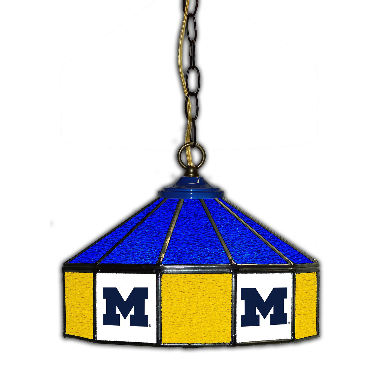 Officially Licensed Collegiate 14-inch Pub Light. Beautifully handcrafted 14-inch diameter old world Tiffany style stained glass hanging pub light. Each piece of glass is individually cut by hand and individually placed by hand. It is then soldered into its proper position with great care and precision by highly trained artists. Fully wired with 1 UL Approved high quality porcelain light socket and a 12-foot cord with inline switch and polarized plug. 9-feet of heavy duty antique brass chain adds a touch of luxury to the lamp. Handmade in the USA. Chain and ceiling mounting hardware not included. Bulb is not included. Lamp measures 14" wide x 10" high; weighs 12 pounds