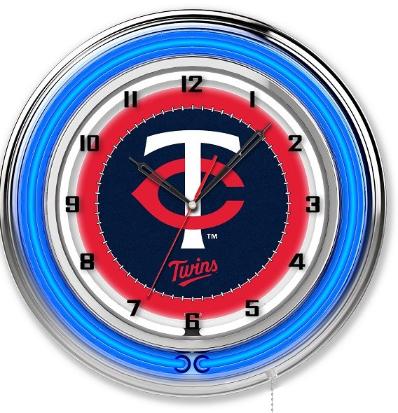 Our double neon MLB Baseball Logo Clocks are the perfect way to show your team pride. Featuring a chrome casing and a team color specific neon outer ring that accents the custom printed clock face which is lit up by a brilliant white, inner neon ring. The Neon rings are easily turned on and off with a pull chain on the bottom of the clock, and are powered by a UL Listed power transformer that runs off standard 120V outlet. Accurate quartz movement ensures proper time and is powered by a single, AA battery (not included). Whether purchasing as a gift for a sports super fan, or for yourself, you can take satisfaction knowing you're buying a clock that is proudly made in Holland, MI USA.
