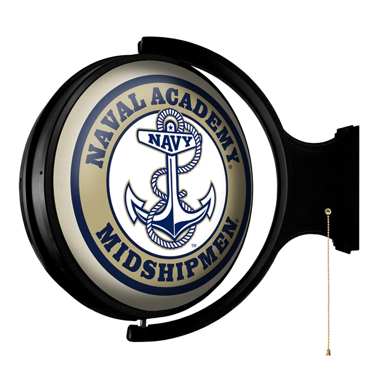 The Original Rotating Lighted Wall Sign both lights up and spins while allowing you to displaying your passion for your team. Whether it's your fan cave, office, game room, or garage, this decorative sign is the perfect addition to any wall. It showcases the latest in LED technology and only uses 12 watts of power. Injection molded, it comes with an 8 foot power cord and a metal pull chain. Mounting hardware included and installation takes no more than 10 minutes. This is an officially licensed product of the Midshipmen and made in the USA.