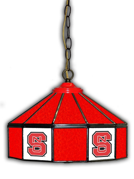 Officially Licensed Collegiate 14-inch Pub Light. Beautifully handcrafted 14-inch diameter old world Tiffany style stained glass hanging pub light. Each piece of glass is individually cut by hand and individually placed by hand. It is then soldered into its proper position with great care and precision by highly trained artists. Fully wired with 1 UL Approved high quality porcelain light socket and a 12-foot cord with inline switch and polarized plug. 9-feet of heavy duty antique brass chain adds a touch of luxury to the lamp. Handmade in the USA. Chain and ceiling mounting hardware not included. Bulb is not included. Lamp measures 14" wide x 10" high; weighs 12 pounds