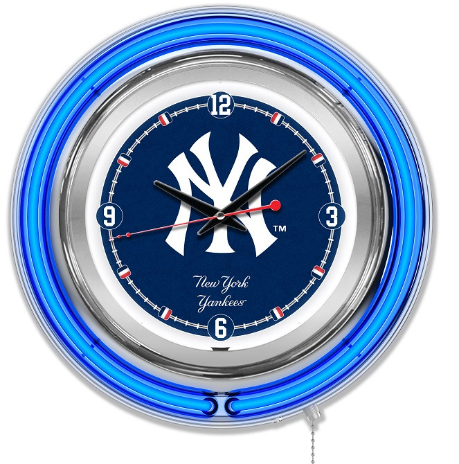 Our double neon MLB Baseball Logo Clocks are the perfect way to show your team pride. Featuring a chrome casing and a team color specific neon outer ring that accents the custom printed clock face which is lit up by an brilliant white, inner neon ring. The Neon rings are easily turned on and off with a pull chain on the bottom of the clock, and are powered by a UL Listed power transformer that runs off standard 120V outlet. Accurate quartz movement ensures proper time and is powered by a single, AA battery (not included). Whether purchasing as a gift for a sports super fan, or for yourself, you can take satisfaction knowing you're buying a clock that is proudly made in Holland, MI USA.
