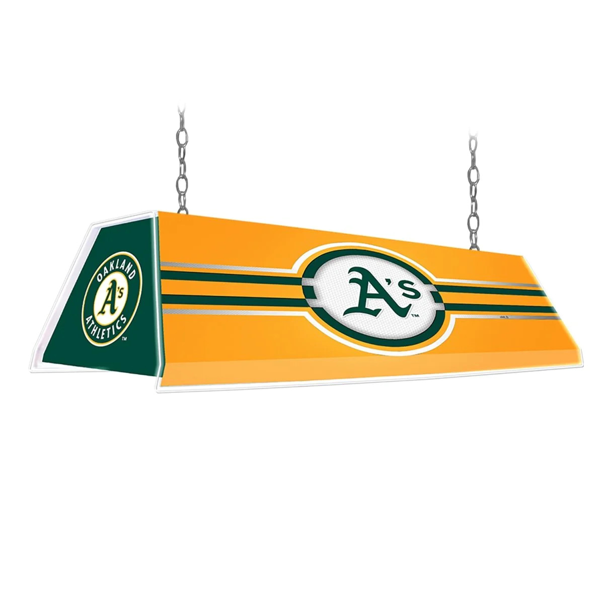 Our new Oakland Athletics edge glow pool table light features an ultra-modern design with edge glow corners and a high-resolution, high gloss image. A perfect piece to decorate any fan cave or billiard room, giving it a modern feel. Hanging hardware included. This is an officially licensed product of the Athletics and made in the USA.
