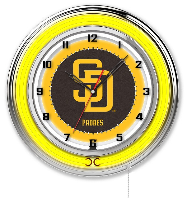 Our double neon MLB Baseball Logo Clocks are the perfect way to show your team pride. Featuring a chrome casing and a team color specific neon outer ring that accents the custom printed clock face which is lit up by a brilliant white, inner neon ring. The Neon rings are easily turned on and off with a pull chain on the bottom of the clock, and are powered by a UL Listed power transformer that runs off standard 120V outlet. Accurate quartz movement ensures proper time and is powered by a single, AA battery (not included). Whether purchasing as a gift for a sports super fan, or for yourself, you can take satisfaction knowing you're buying a clock that is proudly made in Holland, MI USA.