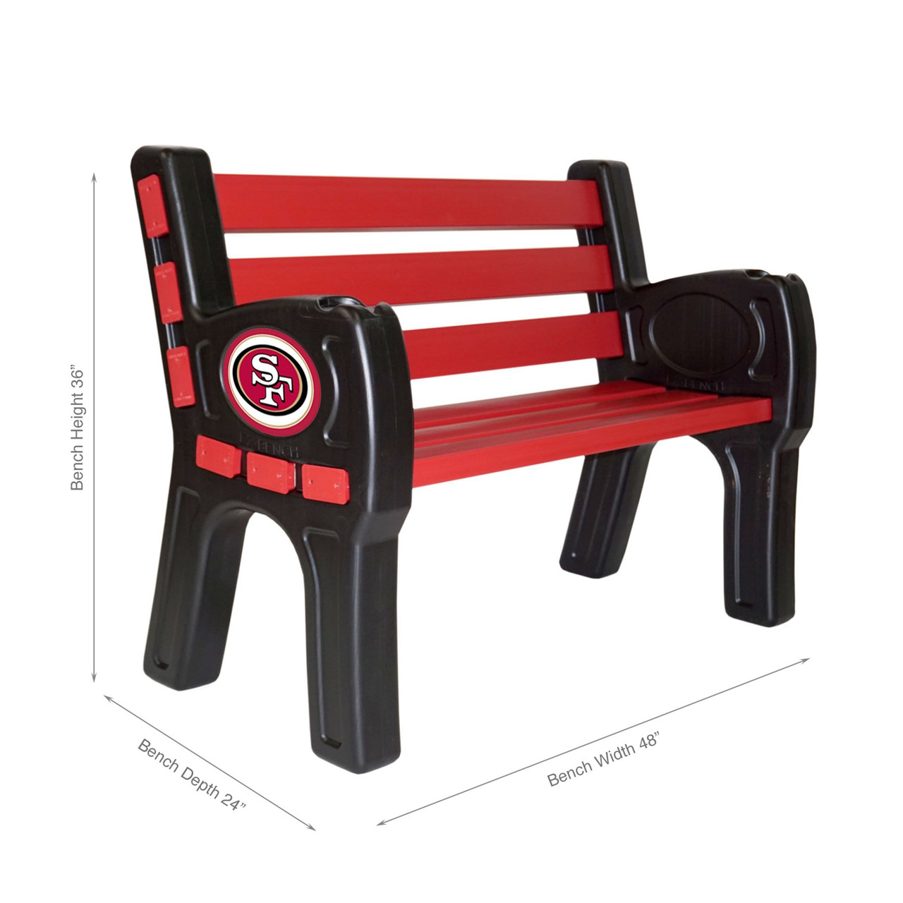 Support your favorite NFL team on your patio or in your yard with the NFL Officially Licensed Park Bench. Backs and seat are constructed of pine and covered with plastic sleeves for extra durability. The bench uses the primary and secondary colors of your favorite team. Made in the USA and ships from Iowa. 600 pound weight limit. Assembled dimensions: 48”L x 24”W x 36”H. Boxed dimensions: 49”L x 10”W x 25”H; weighs 47 pounds. Ships via small parcel. Allow 3 days to ship.