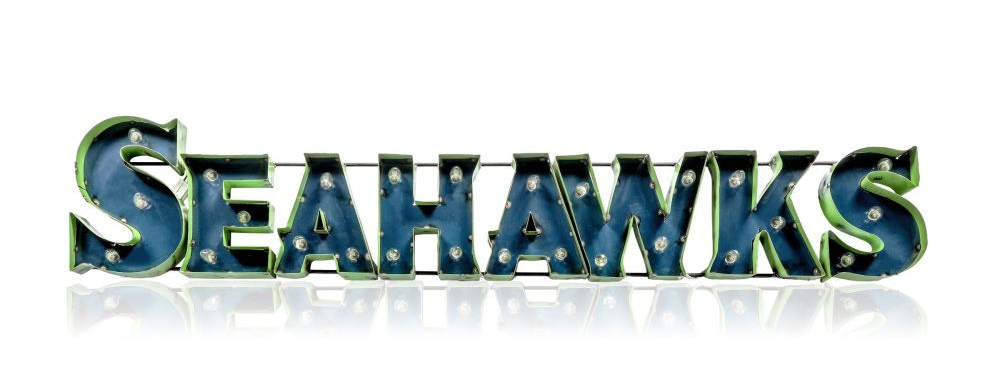 Light up your home or fan-cave with this Seattle Seahawks Lighted Recycled Metal Sign. Suitable for indoor or outdoor use, this sign is built by hand from recycled metals and includes light strands with clear, incandescent C7 glass bulbs. An authentic style décor piece, the sign features channel lettering and exposed weld spots that give a unique, retro look to any space. This product is officially licensed by the NFL.