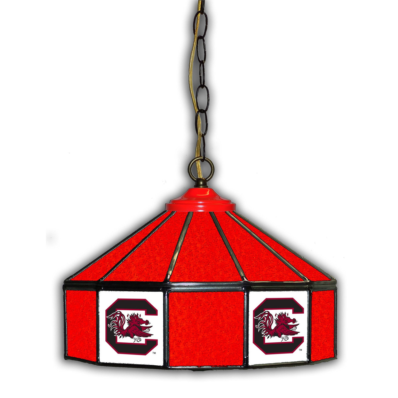 Officially Licensed Collegiate 14-inch Pub Light. Beautifully handcrafted 14-inch diameter old world Tiffany style stained glass hanging pub light. Each piece of glass is individually cut by hand and individually placed by hand. It is then soldered into its proper position with great care and precision by highly trained artists. Fully wired with 1 UL Approved high quality porcelain light socket and a 12-foot cord with inline switch and polarized plug. 9-feet of heavy duty antique brass chain adds a touch of luxury to the lamp. Handmade in the USA. Chain and ceiling mounting hardware not included. Bulb is not included. Lamp measures 14" wide x 10" high; weighs 12 pounds