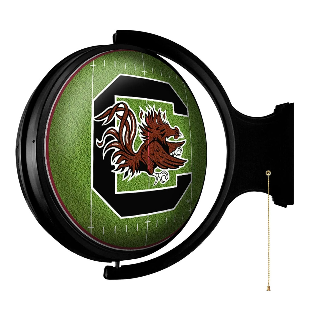 Our Football "On the 50" Rotating Lighted Wall Sign both lights up and spins while allowing you to display your passion for your favorite team. Whether it's your fan cave, office, game room, or garage, this decorative football field design makes a great addition to any wall and is sure to get you ready for gamedays. It showcases the latest in LED technology and only uses 12 watts of power. Injection molded, it comes with an 8 foot power cord and a metal pull chain. Mounting hardware included and installation takes no more than 10 minutes. This is an officially licensed product of the NCAA and is made in the USA.