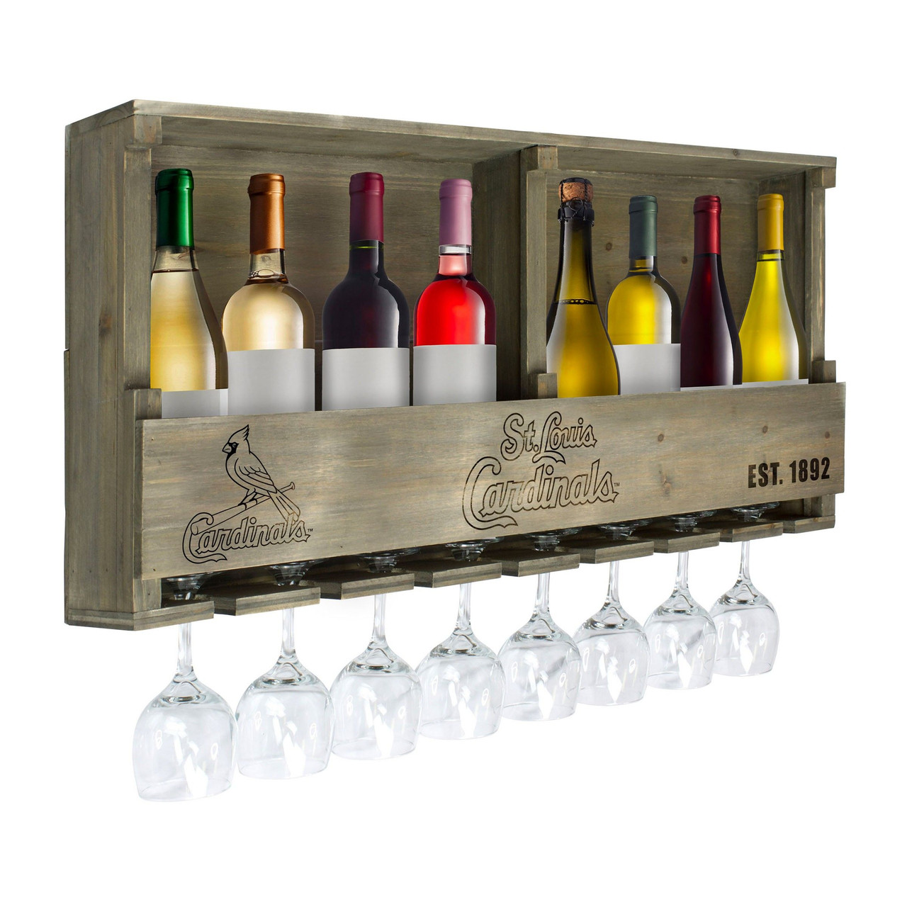 Enjoy your team themed bar shelf for years to come. Holds up to 8 bottles and 8 stem glasses easily. You choose your favorite beverage and team! The vintage reclaimed look will fit in anywhere you gather your friends and family. Perfect gift for the fan who has everything. Mounts easily to any wall.