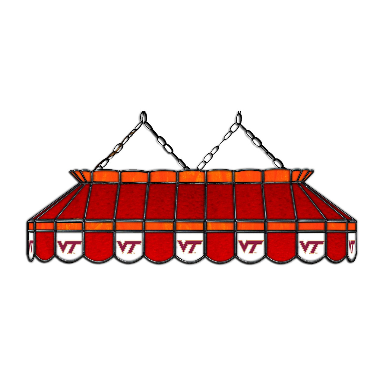 Light up your pool table and show off your team spirit with the NCAA Official Licensed 40-inch Rectangular Stained Glass Pool Table Light. Real stained glass that matches your favorite team's colors. Each piece of glass is hand cut and soldered into its proper place with care and precision. Team logos are screen-printed directly onto the glass. There are 14 logos per lamp. Includes hanging chain, ceiling mounting plate, and installation instructions.