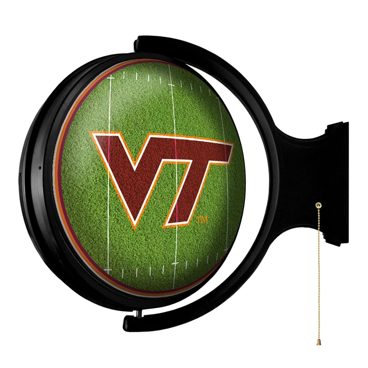 Our Football "On the 50" Rotating Lighted Wall Sign both lights up and spins while allowing you to display your passion for your favorite team. Whether it's your fan cave, office, game room, or garage, this decorative football field design makes a great addition to any wall and is sure to get you ready for gamedays. It showcases the latest in LED technology and only uses 12 watts of power. Injection molded, it comes with an 8 foot power cord and a metal pull chain. Mounting hardware included and installation takes no more than 10 minutes. This is an officially licensed product of the NCAA and is made in the USA.