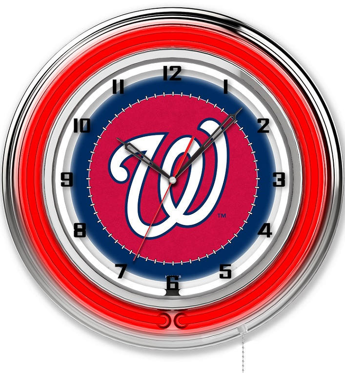 Our double neon MLB Baseball Logo Clocks are the perfect way to show your team pride. Featuring a chrome casing and a team color specific neon outer ring that accents the custom printed clock face which is lit up by a brilliant white, inner neon ring. The Neon rings are easily turned on and off with a pull chain on the bottom of the clock, and are powered by a UL Listed power transformer that runs off standard 120V outlet. Accurate quartz movement ensures proper time and is powered by a single, AA battery (not included). Whether purchasing as a gift for a sports super fan, or for yourself, you can take satisfaction knowing you're buying a clock that is proudly made in Holland, MI USA.
