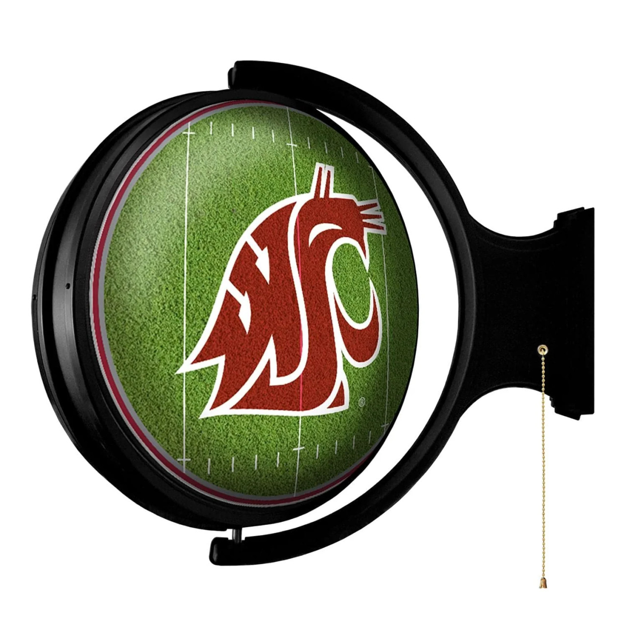 Our Football "On the 50" Rotating Lighted Wall Sign both lights up and spins while allowing you to display your passion for your favorite team. Whether it's your fan cave, office, game room, or garage, this decorative football field design makes a great addition to any wall and is sure to get you ready for gamedays. It showcases the latest in LED technology and only uses 12 watts of power. Injection molded, it comes with an 8 foot power cord and a metal pull chain. Mounting hardware included and installation takes no more than 10 minutes. This is an officially licensed product of the NCAA and is made in the USA.