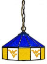 Officially Licensed Collegiate 14-inch Pub Light. Beautifully handcrafted 14-inch diameter old world Tiffany style stained glass hanging pub light. Each piece of glass is individually cut by hand and individually placed by hand. It is then soldered into its proper position with great care and precision by highly trained artists. Fully wired with 1 UL Approved high quality porcelain light socket and a 12-foot cord with inline switch and polarized plug. 9-feet of heavy duty antique brass chain adds a touch of luxury to the lamp. Handmade in the USA. Chain and ceiling mounting hardware not included. Bulb is not included. Lamp measures 14" wide x 10" high; weighs 12 pounds