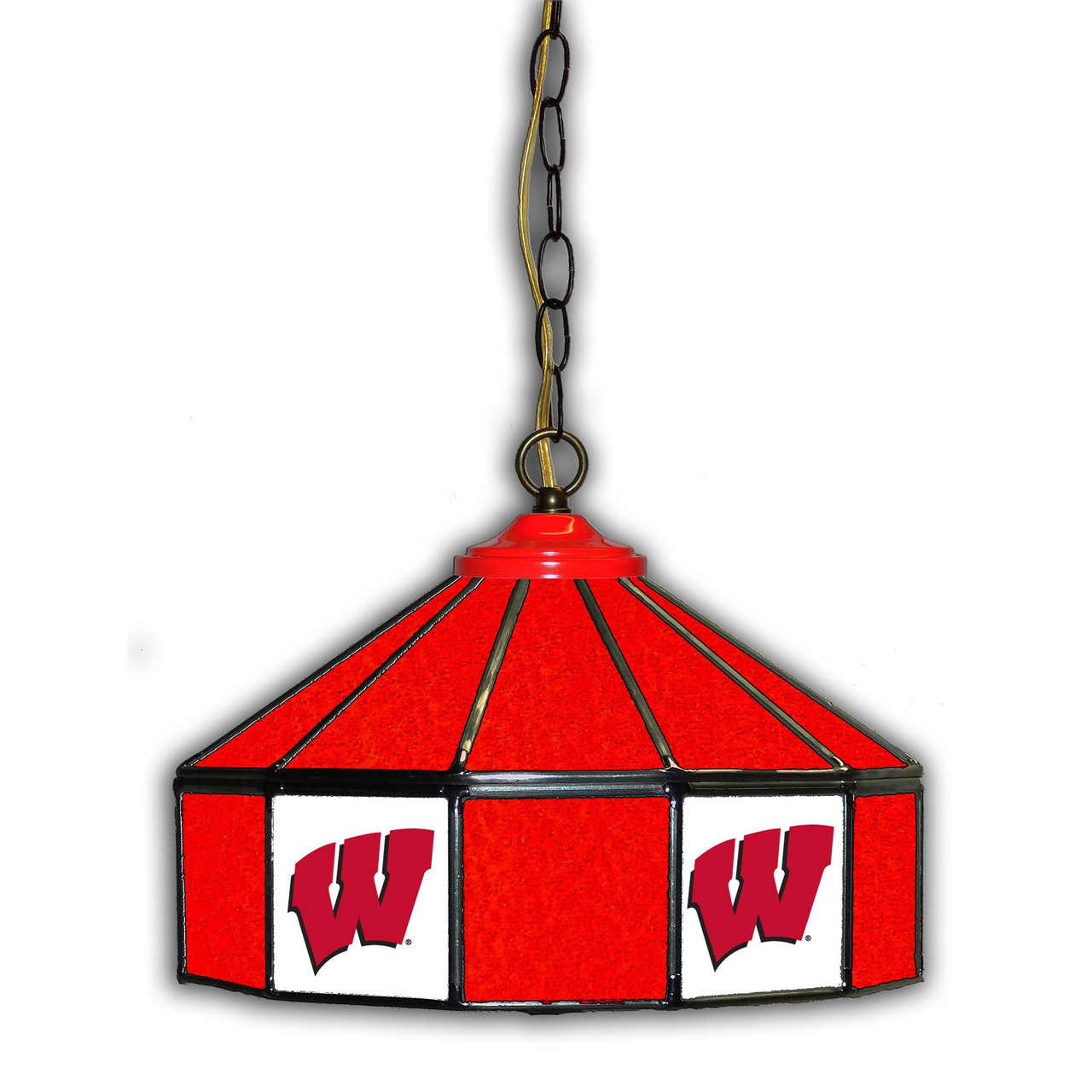 Officially Licensed Collegiate 14-inch Pub Light. Beautifully handcrafted 14-inch diameter old world Tiffany style stained glass hanging pub light. Each piece of glass is individually cut by hand and individually placed by hand. It is then soldered into its proper position with great care and precision by highly trained artists. Fully wired with 1 UL Approved high quality porcelain light socket and a 12-foot cord with inline switch and polarized plug. 9-feet of heavy duty antique brass chain adds a touch of luxury to the lamp. Handmade in the USA. Chain and ceiling mounting hardware not included. Bulb is not included. Lamp measures 14" wide x 10" high; weighs 12 pounds
